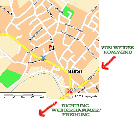 in den Markt Mantel einbiegen. Immer auf der Hauptstraße bleiben,